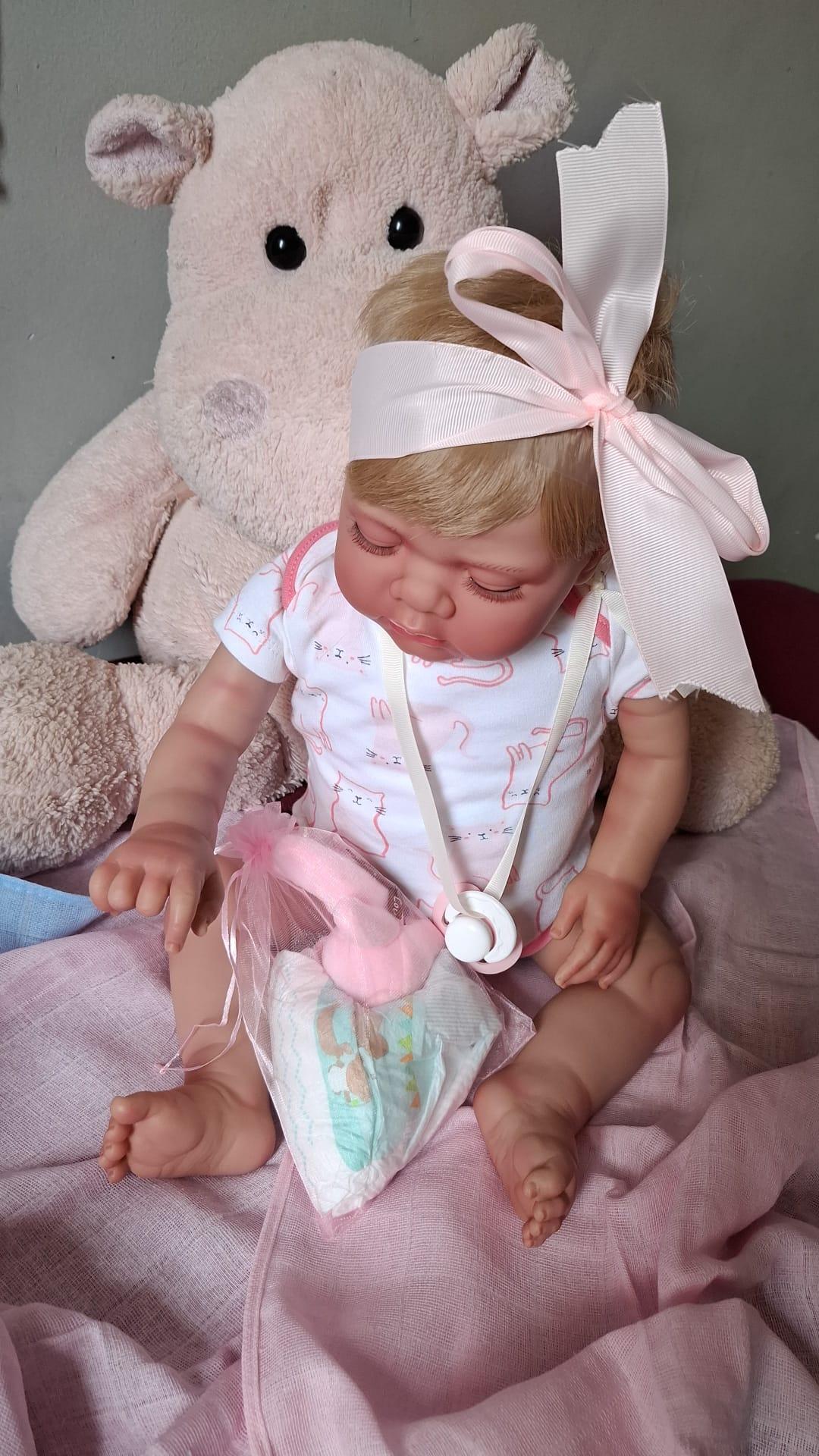 NEREA....,otra de nuestras novedades en Mis Muñecas Reborns";),esta bebé reborn tiene ojitos cerrados(fijos) y una expresión muy real,su pelo rubio es resistente y tupido (cosido)fácil de peinar y resistente,como es de la serie "Real Baby"tiene las mismas características (mide 52 cm,pesa 2,3 kg, efecto piel, movilidad, cuerpo de tela, extremidades completas de vinilo, chupete que le encaja,etc)...Nerea esta esperando a que la "adoptes"y le des muuuchos mimos..,te decides a llevártela contigo???;)